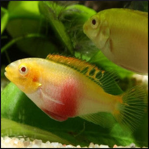 The Kribensis Cichlid, which originated from Western Africa is tank-raised and is one of the easier African Cichlids to breed. They have an elongated shape and are black in color with a yellow stripe and red belly. The belly takes on a more vivid red coloration during times of breeding. This is one of the smaller African Cichlids, and is often referred to as a dwarf Cichlid.The Kribensis Cichlid is ideally kept in a 50-gallon or larger aquarium. Male Kribensis, whether full coloration or albino, are often more attracted to the albino female because of the intense red that the albino female displays during breeding. They are a cave spawning species so plenty of rocks and caves should be provided. Feed the fry baby brine shrimp and finely ground flake food.