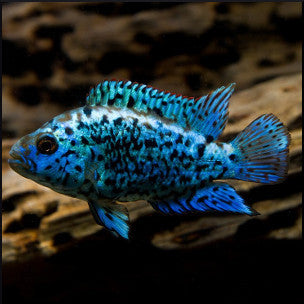 The Electric Blue Jack Dempsey is a freshwater fish that originates in the murky warm waters of Central America. It has a base color of electric blue to gray, and displays many iridescent blue and green spots, giving this fish a spectacular look. When breeding, these colors will intensify. The dorsal fin is lined in red, and the female's overall coloration is subdued compared to the male.